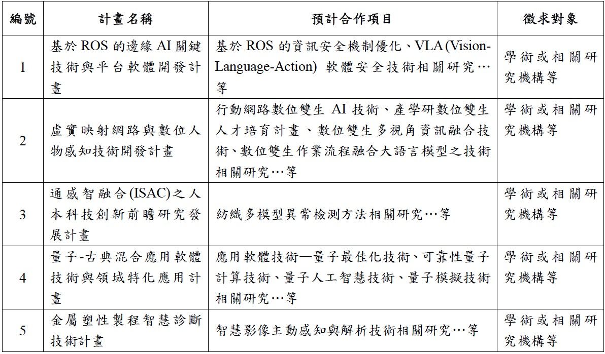 資策會執行經濟部115年度科技專案補助/委託計畫預計執行合作研究項目及徵求對象規劃如下表,惟合作研究項目及經費等內容,將依資策會與經濟部簽約計畫書進行調整,特此聲明。